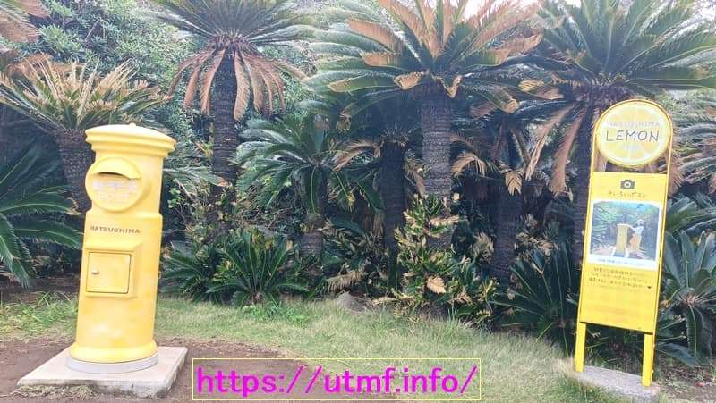 レモンバス停に黄色いポスト。背景は南国の植物。